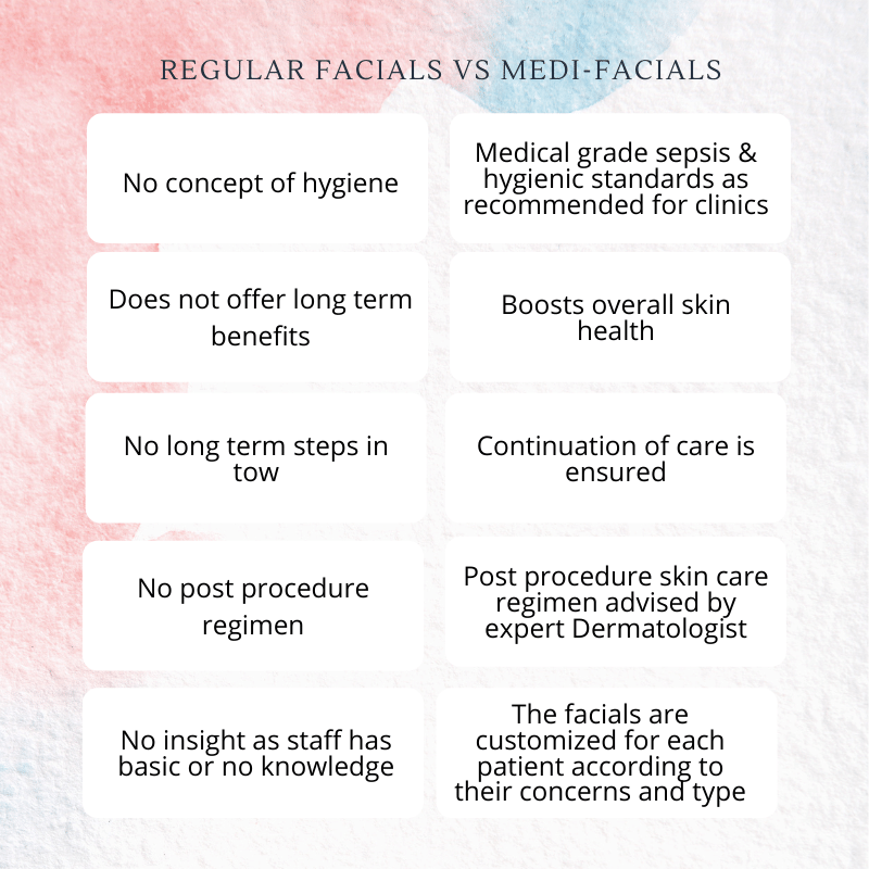 Q: How is a medifacial different from a regular spa facial? A: A medifacial uses medical-grade ingredients and clinical technologies that penetrate deeper into the skin and produce measurable results. A spa facial primarily focuses on surface cleansing and relaxation. The medifacial is designed and supervised by a doctor, ensuring it is both safe and therapeutically effective.