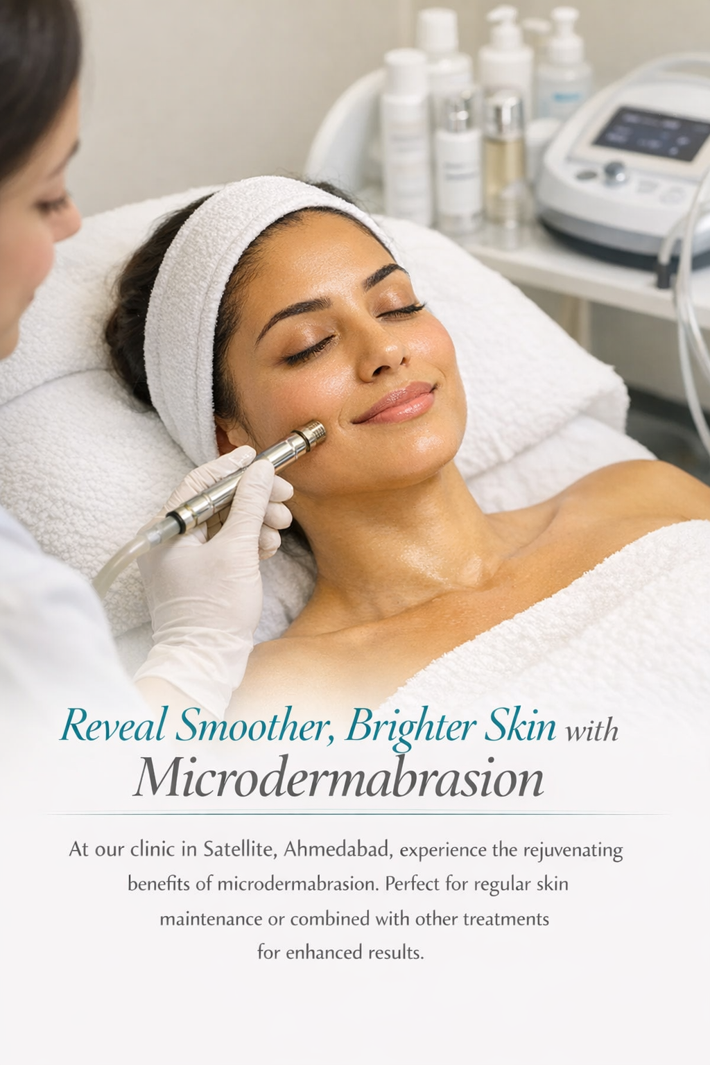 Microdermabrasion is one of the most approachable skin treatments available - it is comfortable, quick, and requires no recovery time whatsoever. Using either fine crystals or a diamond-tipped exfoliation wand, the treatment physically removes the outermost layer of dead and damaged skin cells, revealing smoother, brighter skin beneath. Patients at our clinic in Satellite, Ahmedabad often combine microdermabrasion with other treatments for enhanced results, or simply use it as a reliable regular skin maintenance option.